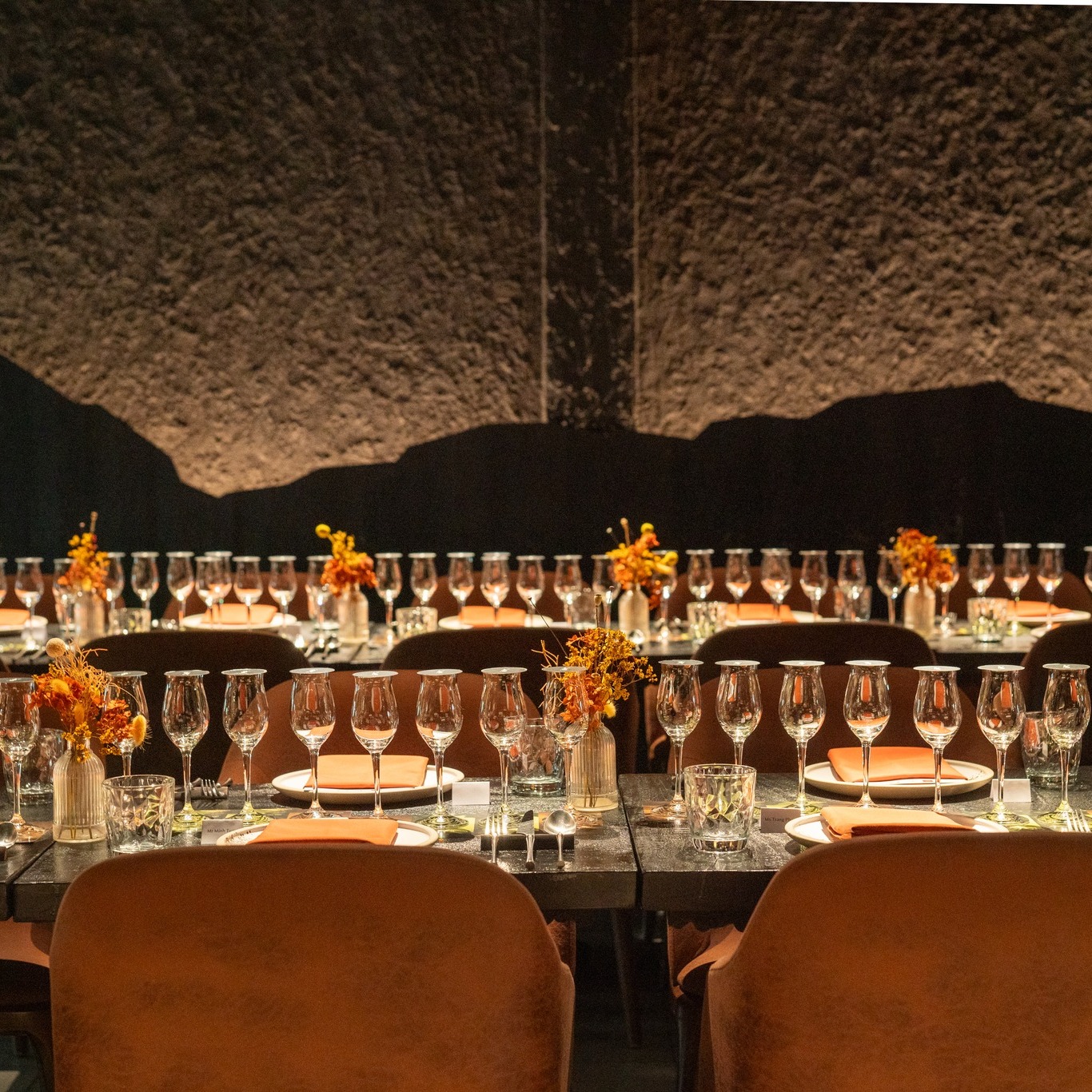 The interior blends warm earthy tones and soft ambient lighting, creating an atmosphere that is both elegant and intimate — perfect for romantic dinners, business meetings, or private dining experiences.