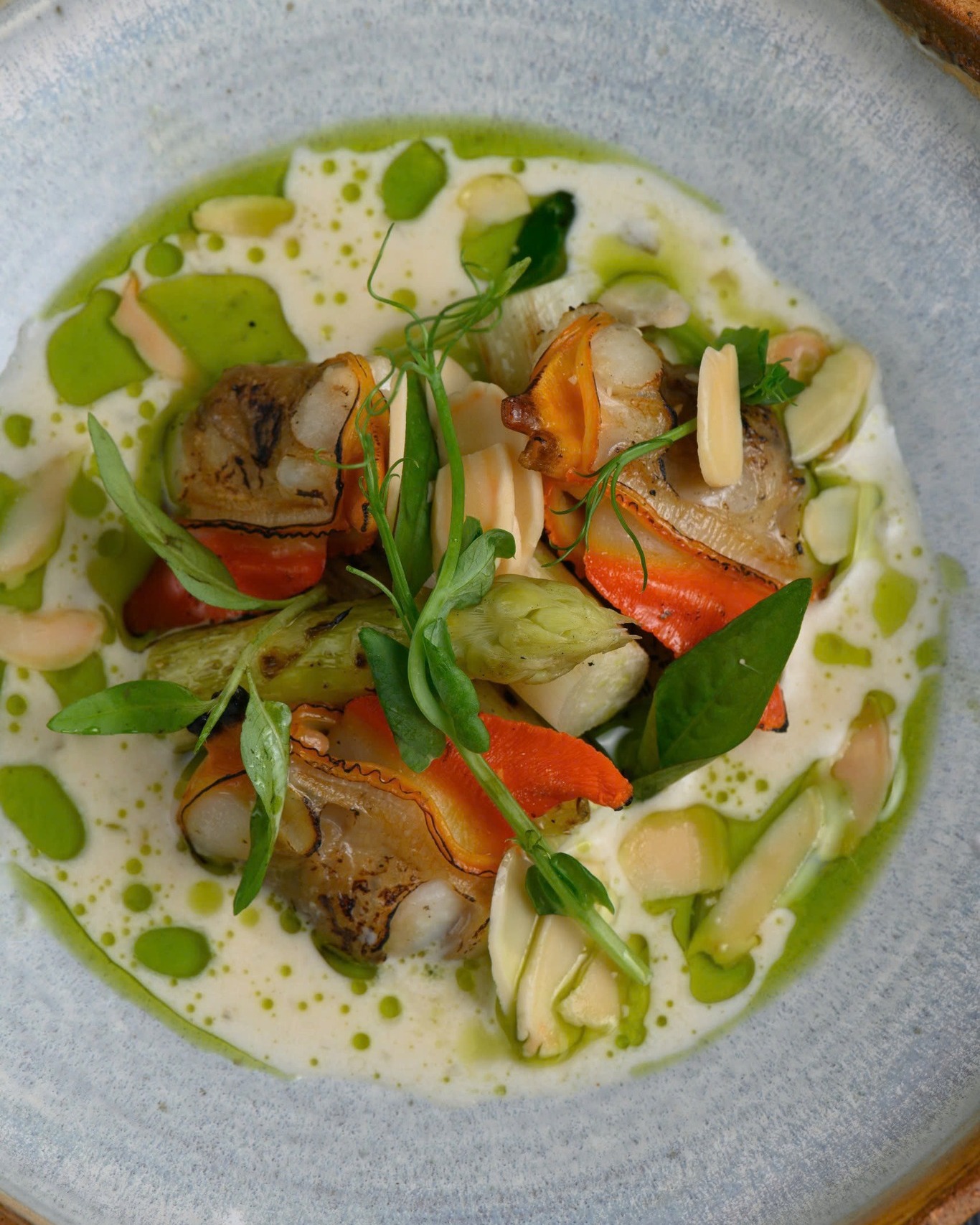 - The French-style butter sauce is delicately infused with lá giang — a native Vietnamese herb — offering a gentle acidity and herbal aroma.