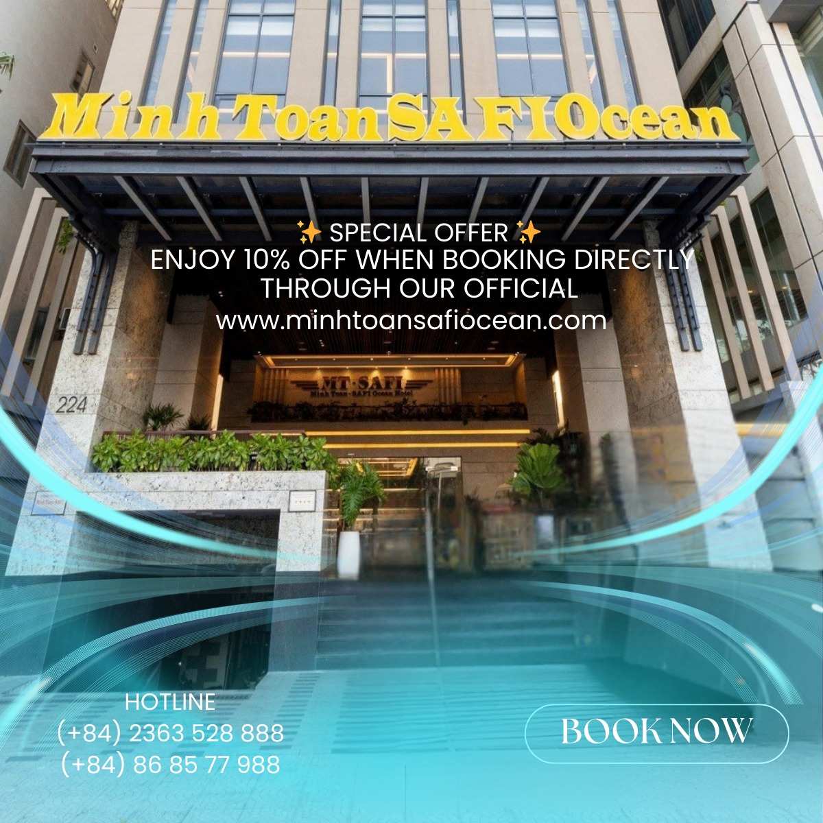 Located along the vibrant Vo Nguyen Giap coastal road, Minh Toan SAFI Ocean Hotel is an ideal destination for leisure stays, professional conferences, and elegant events. With refined design, spacious venues, and international-standard 4-star services, the hotel delivers a complete experience where every moment is carefully crafted with sophistication and care.